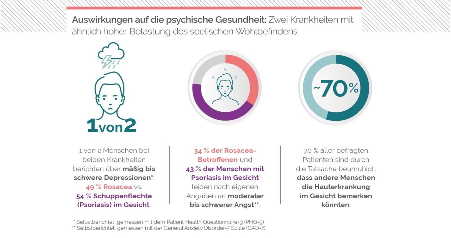 Die Ergebnisse beider Befragungen zeigen, dass Hautkrankheiten des Gesichts wie Rosacea – und auch Schuppenflechte – für die meisten Betroffenen einen sehr großen Einfluss auf die Lebensqualität haben. Die Belastung durch Rosacea ist dabei vergleichbar mit der durch Schuppenflechte mit Gesichtsbeteiligung.