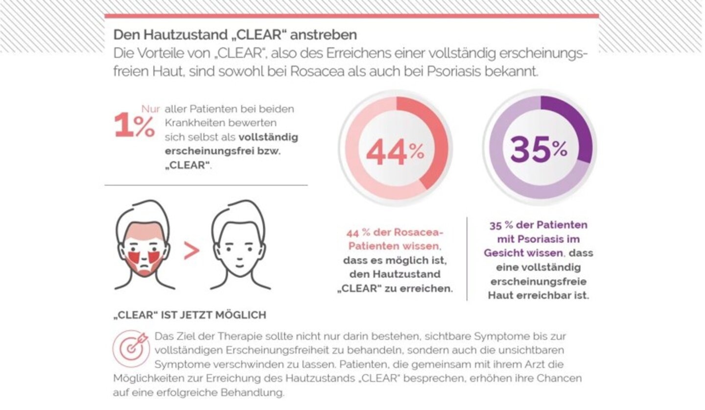 Besonders positiv zu werten ist, dass die Vorteile von „CLEAR“, also des Erreichens einer vollständig erscheinungsfreien Haut, sowohl bei Rosacea als auch bei Psoriasis bekannt sind: 44 % der Rosacea-Patient:innen und 35 % der Patient:innen mit Psoriasis im Gesicht bestätigen, dass es möglich ist, den Hautzustand „CLEAR“ zu erreichen.2